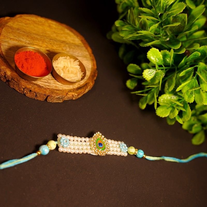 Elegant Blue Bead Thread Rakhi, handcrafted with care and paired with complimentary roli chawal for a meaningful Raksha Bandhan celebration.