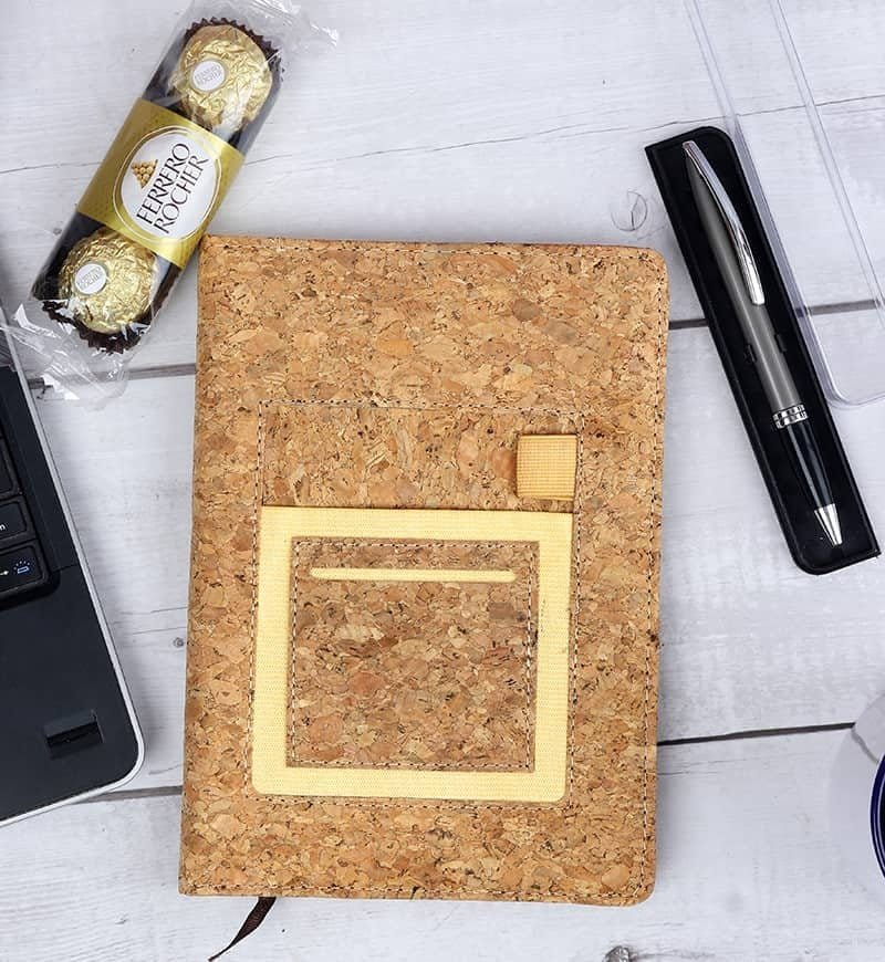 A cork hardcover notebook is a stylish and eco-friendly writing companion featuring a durable cork cover that adds a touch of natural elegance to your notes and ideas. Its pages provide a smooth and inviting surface for your thoughts and sketches. - In box: Notepad, Pen & Ferrero Rocher