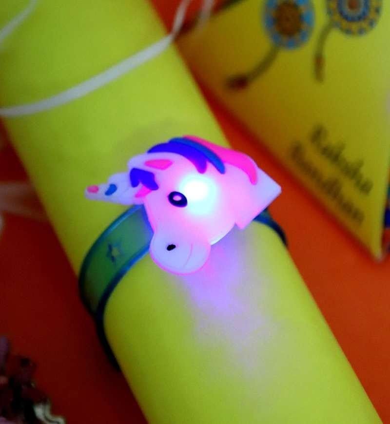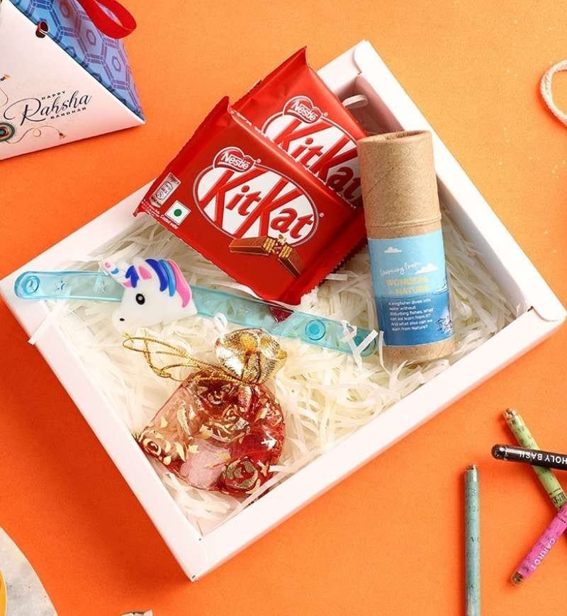 Kids Lighting Unicorn Rakhi with Seed Pencil Set, a magical and eco-friendly way to celebrate Rakhi Festival! Kids can wear the silicone slap band which can be used for sweet bragging. The hamper will add love to the kid’s happiness with a beautiful gift set which includes an organic seed colorful pencil box along with Kit-Kat crunchy chocolates. It also comes up with Roli, Chawal, and Mishri Set in a cork glass bottle. Let the bond between kids also shine with this enchanting Rakhi set!