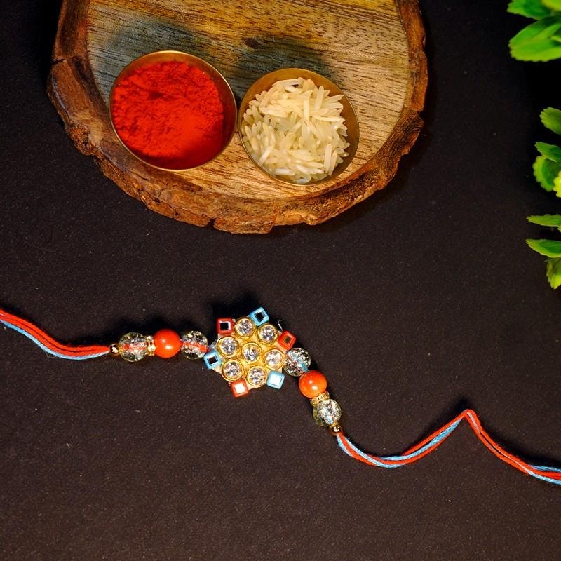 Celebrate the joyful spirit of Raksha Bandhan with this vibrant Multicoloured Flower Bead Thread Rakhi. Featuring colourful beads arranged in a beautiful floral pattern on a soft thread, this Rakhi blends tradition with a splash of colour. Comes with complimentary roli chawal to complete the sacred ceremony.