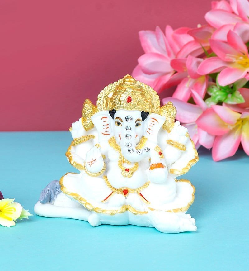 A polyresin Ganesha idol, radiating spiritual elegance. Ideal for home or office decor, symbolizing blessings and tranquility. Perfect Gift for Housewarming, Birthday, Wedding Anniversary, Diwali, Thanksgiving and other Occasions. and never use any harsh chemicals or never rub it with any rough surface, wipe it with clean piece of dry Cloth. Height: 4.5 Inches